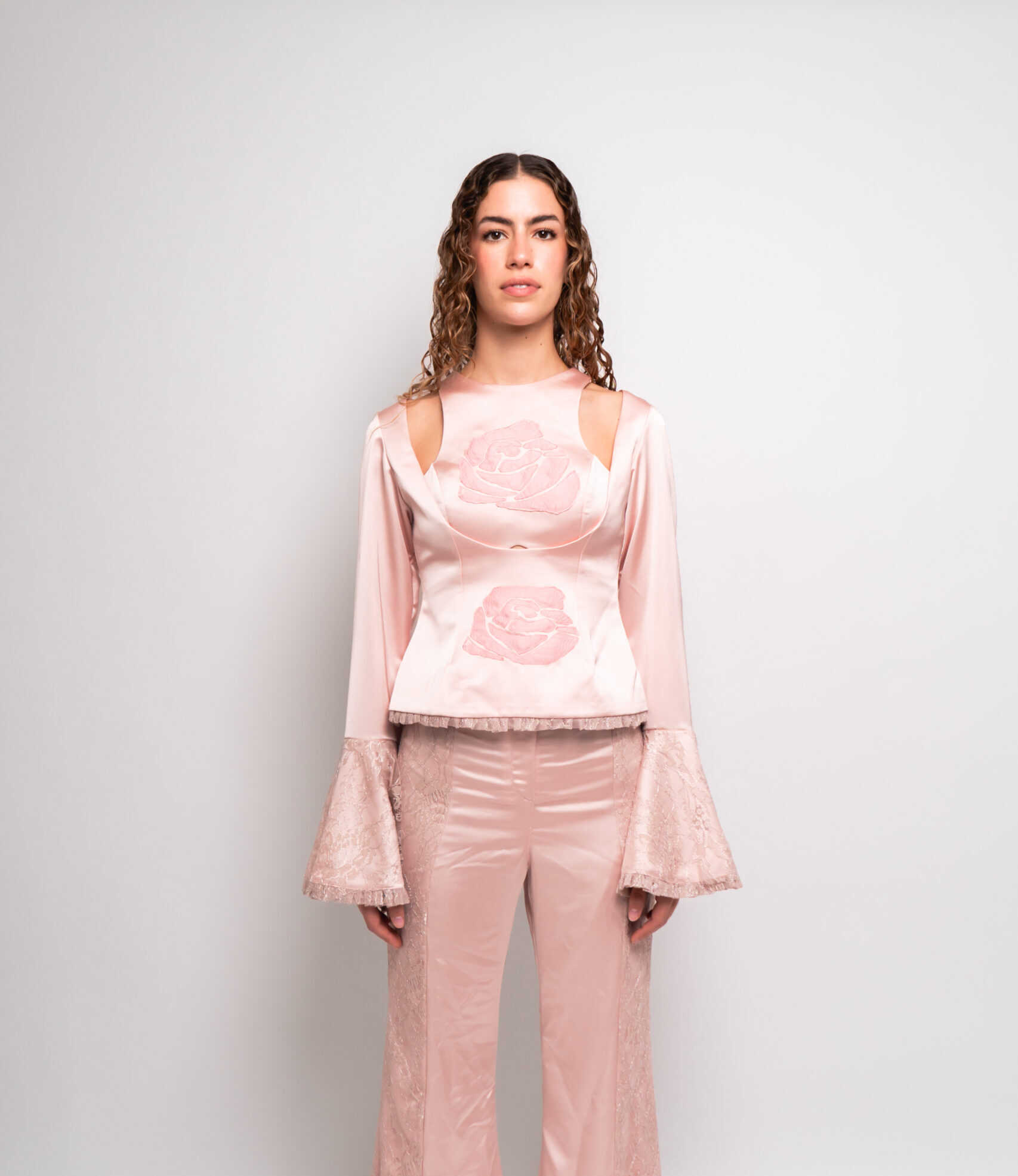 conjunto loungewear 3 piezas: sobre camisa con croptop y pantalones acampanados con abertura