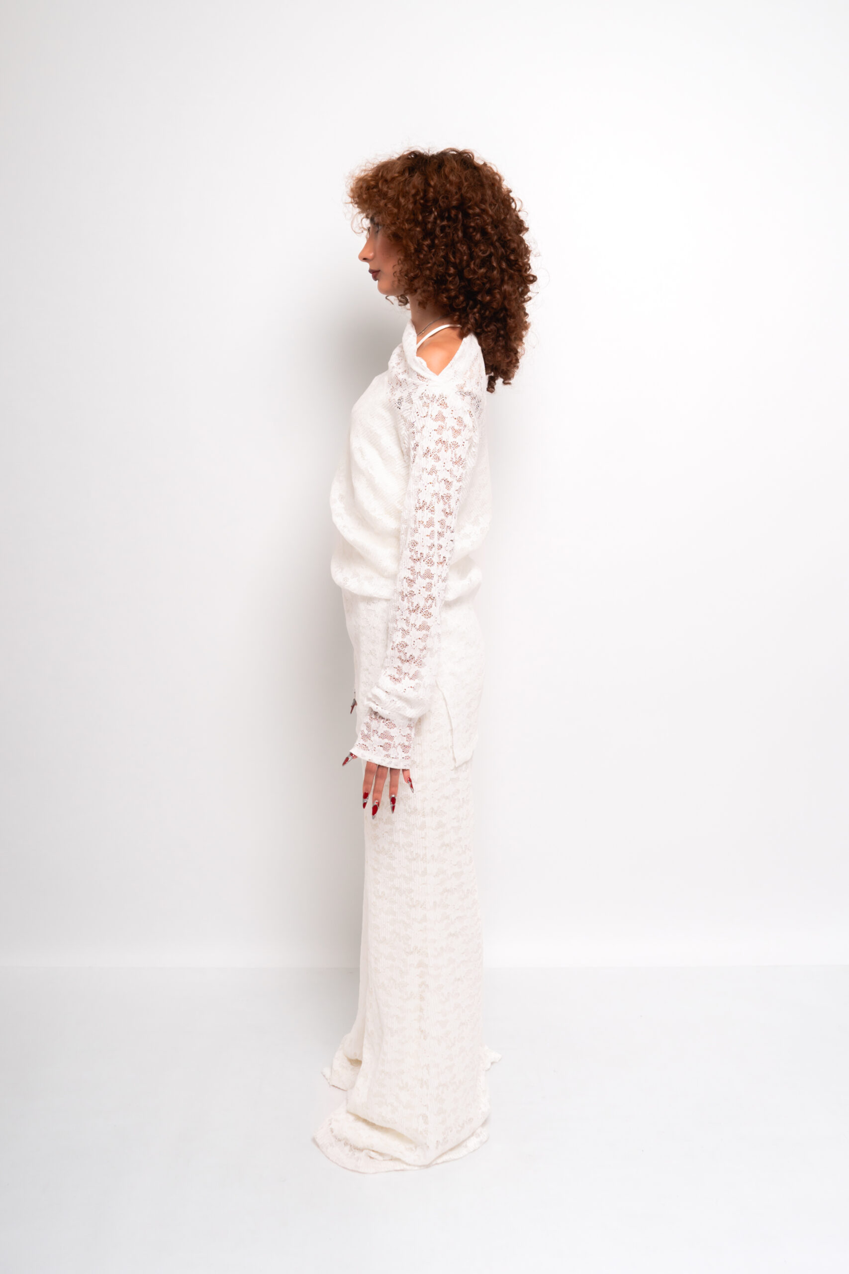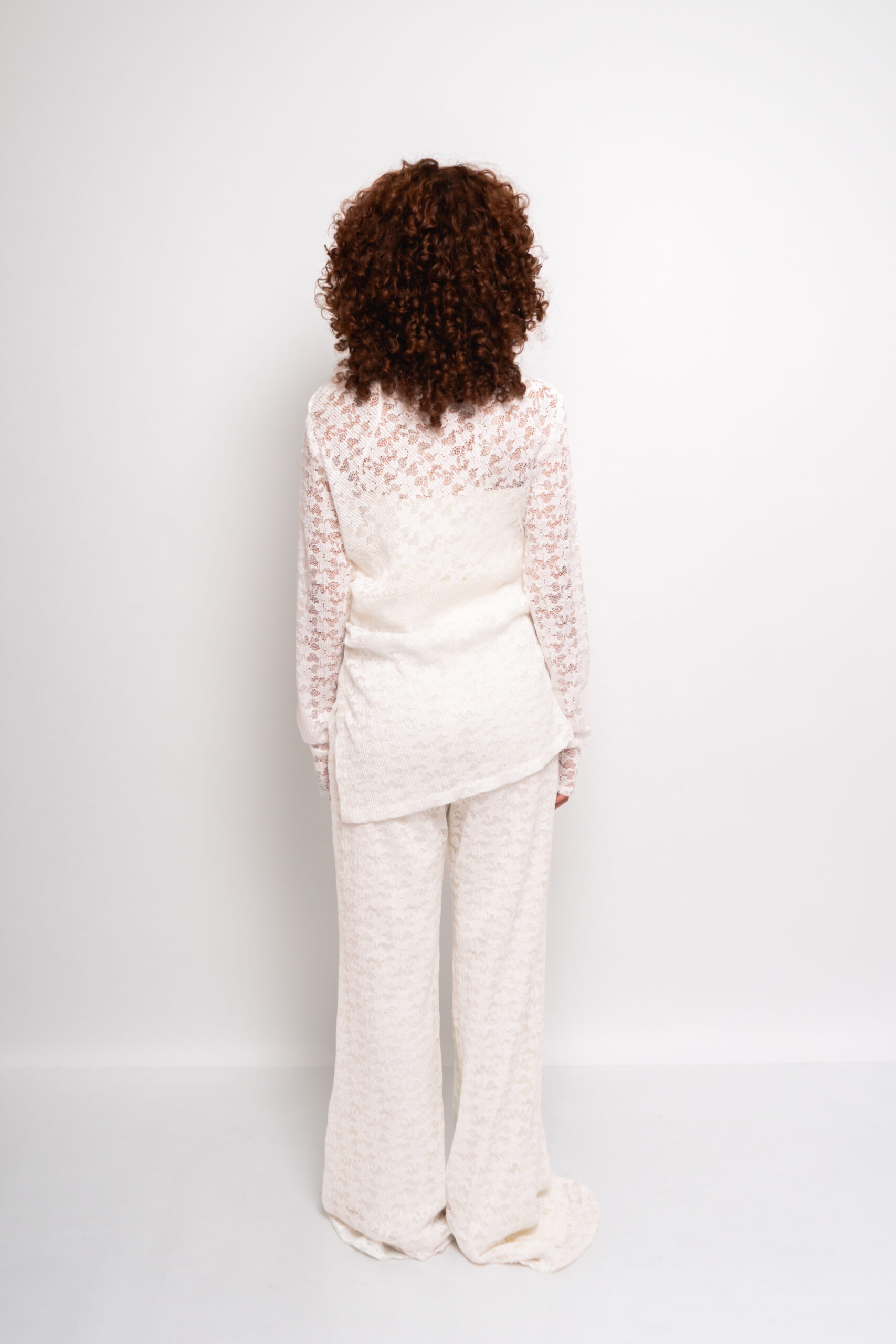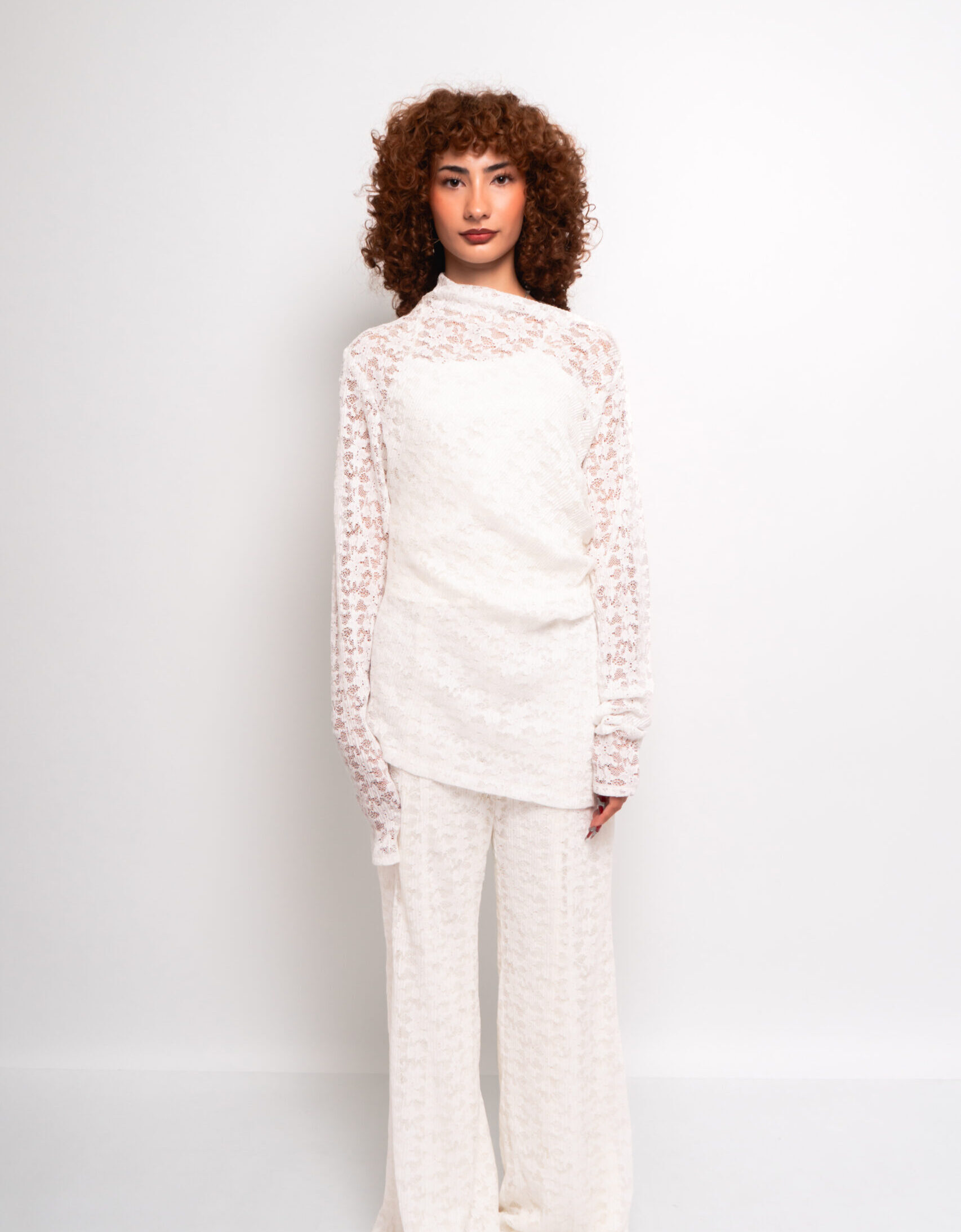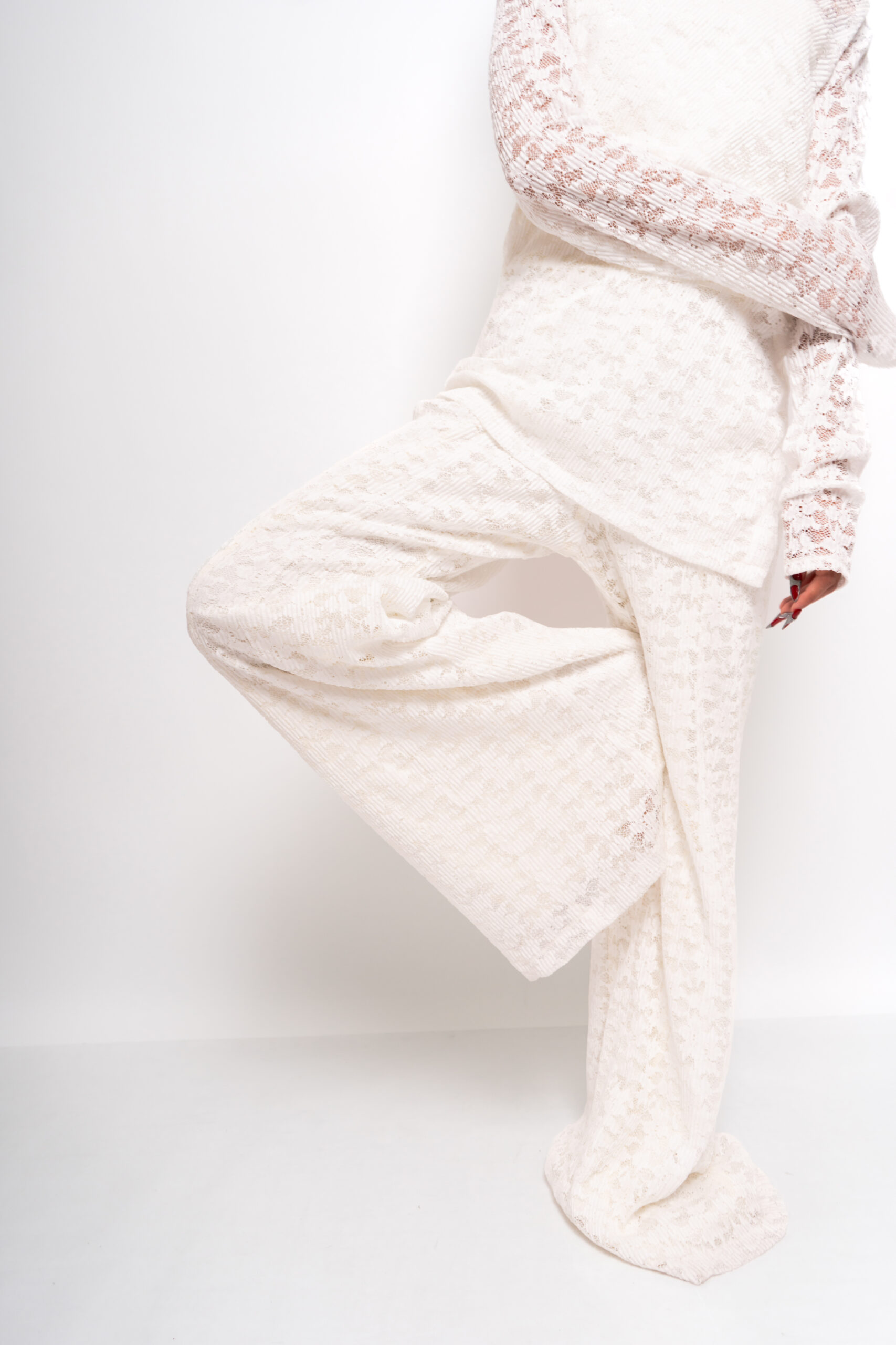 Conjunto loungewear 3 piezas con tank basica y blusa asimétrica con encaje plisado, pantalón corte acampanado