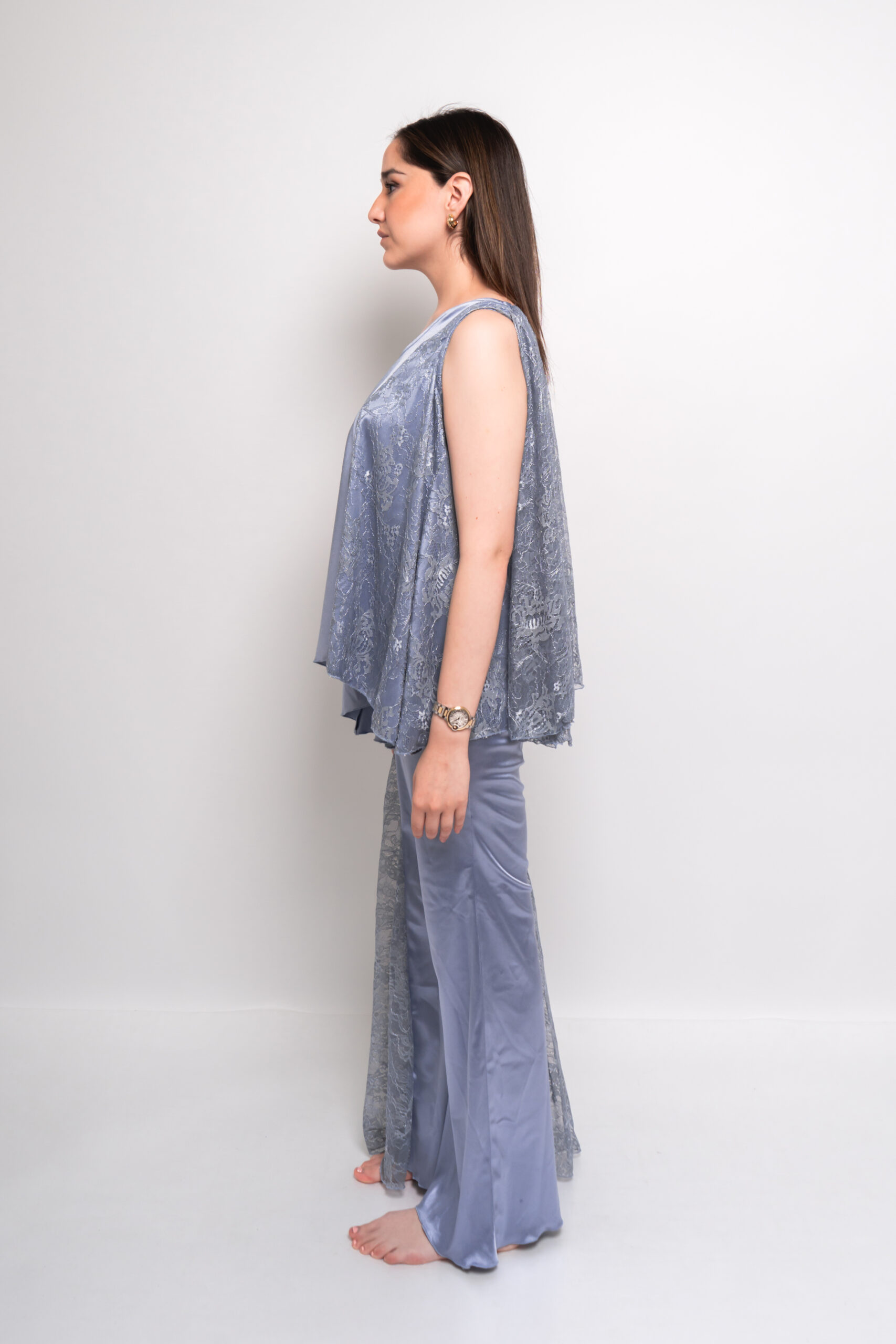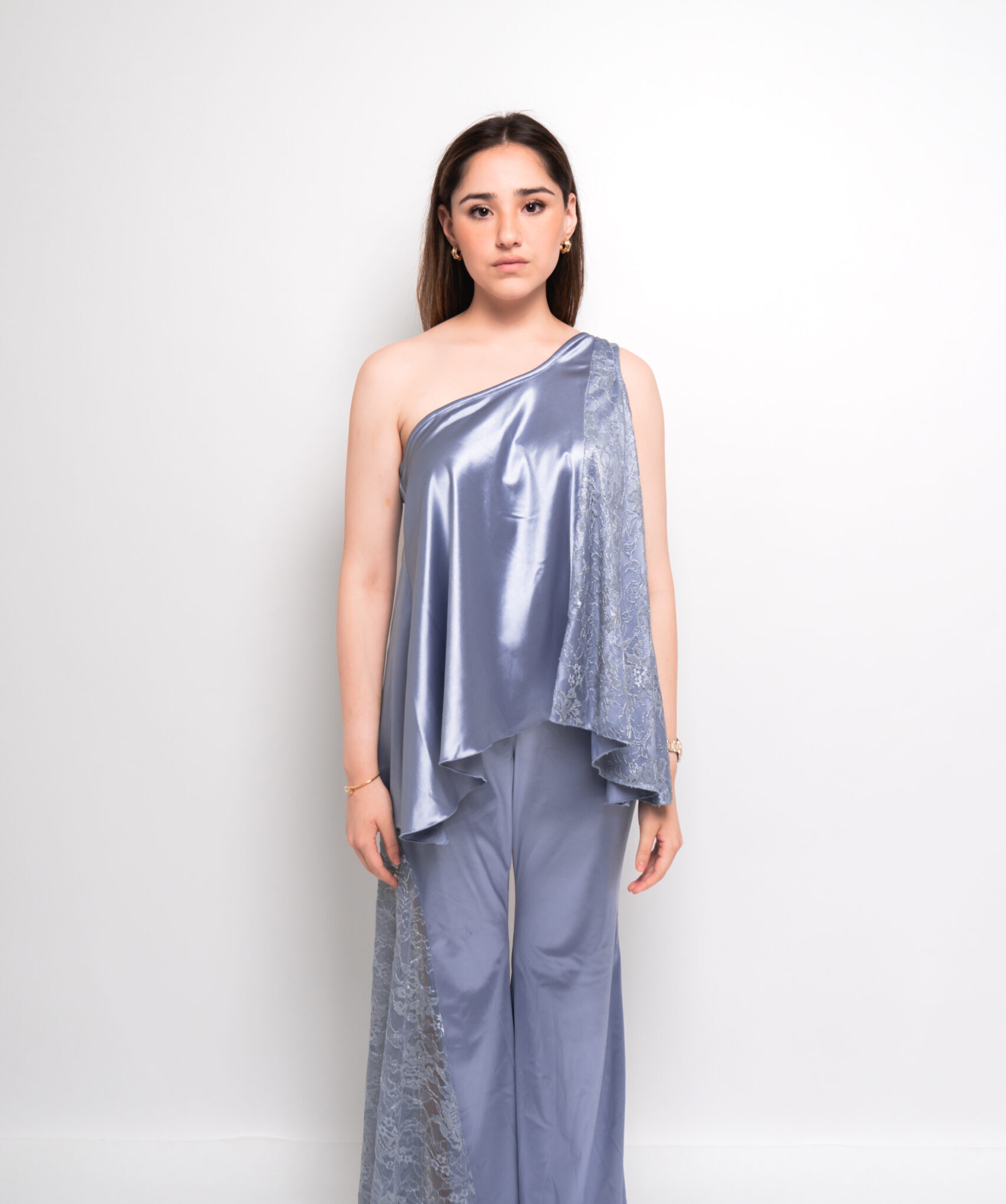 Top asimétrico  con encaje y tela base strech satinada con  pantalón wide leg y detalle de encaje