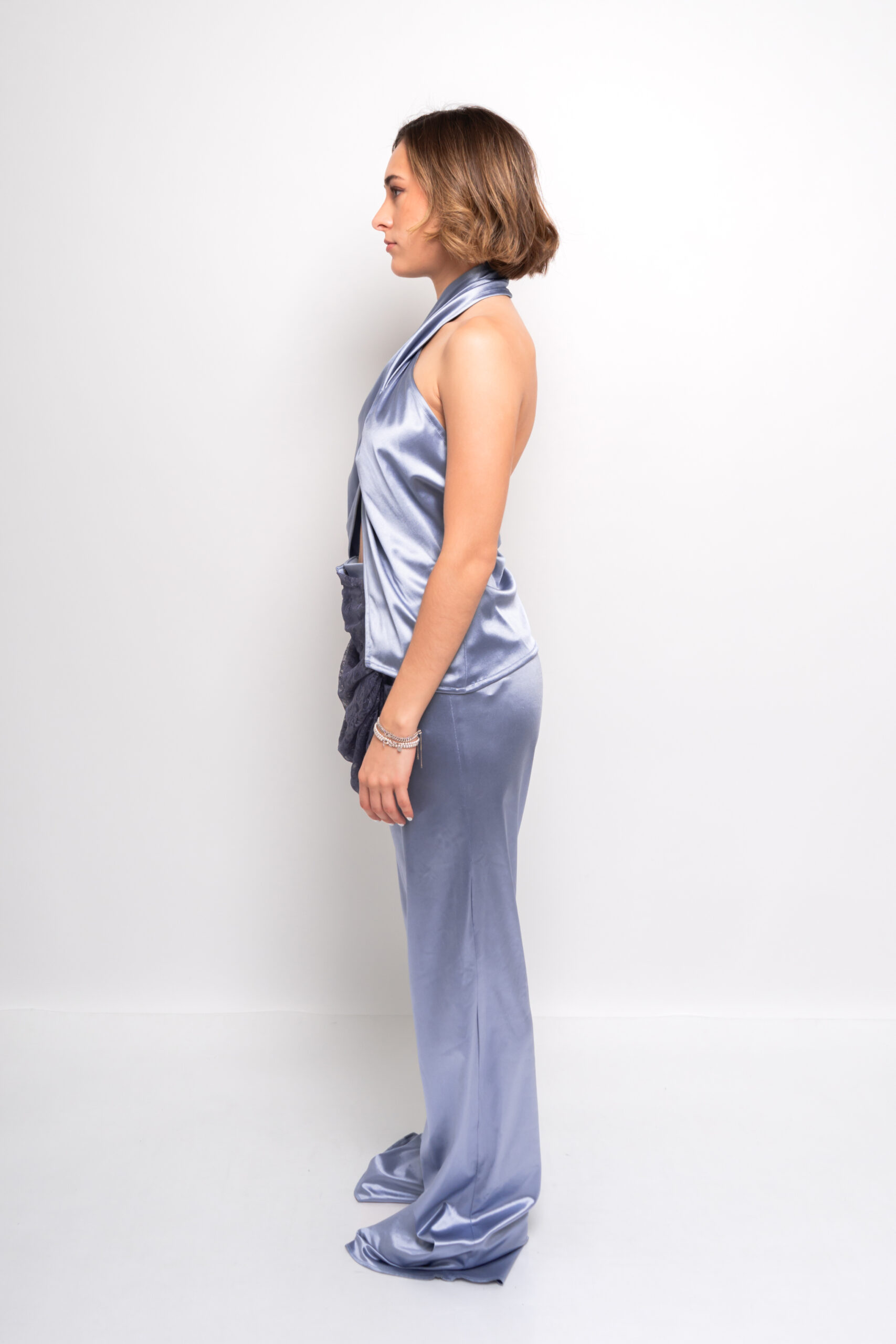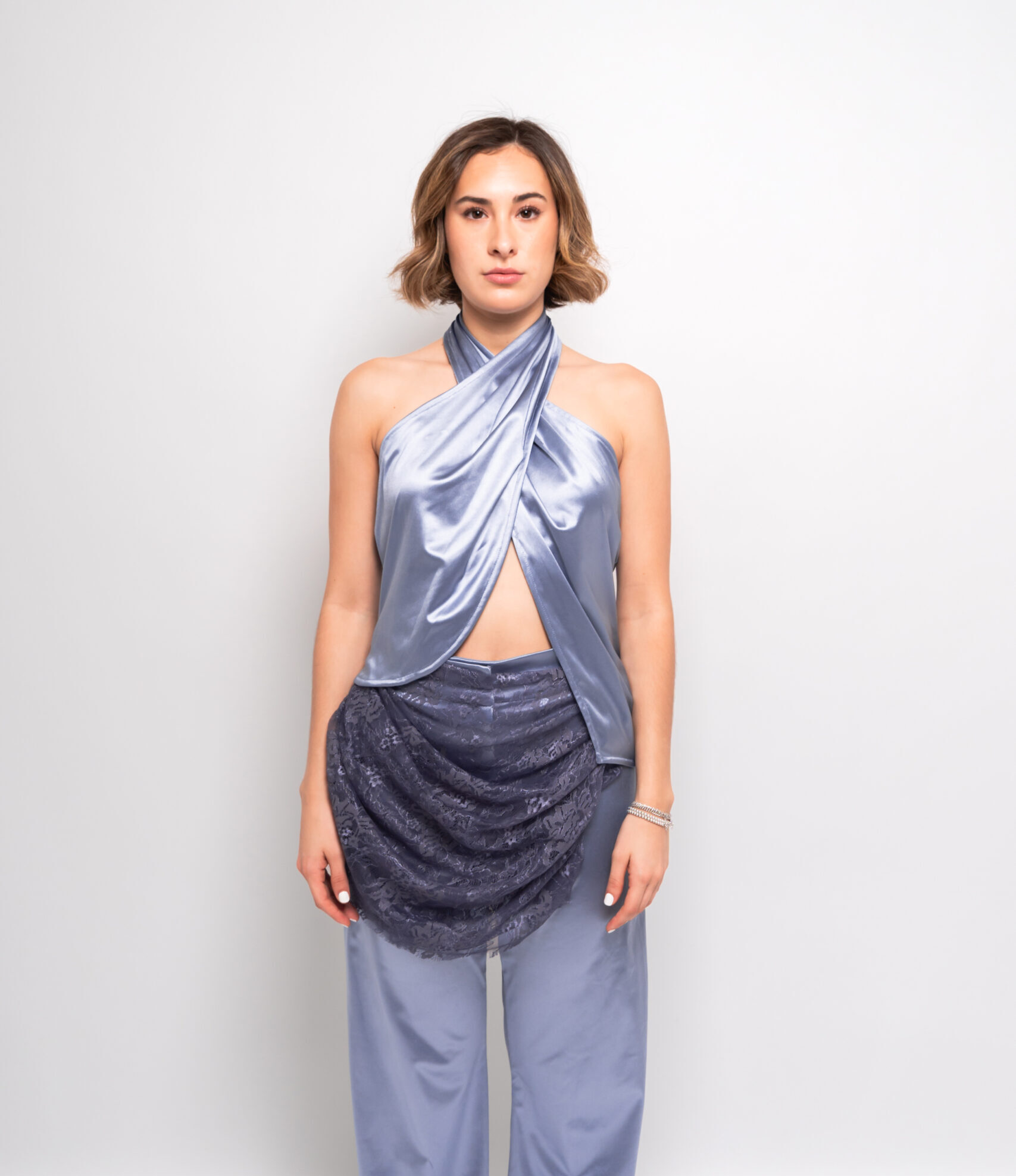 Top cruzado halter con pantalón wide leg y falda asimétrica plisada con encaje